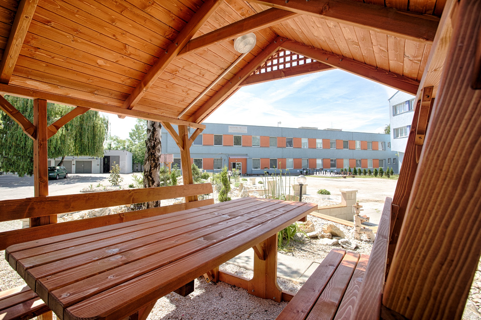 Záhradný maxišach a petangové ihrisko priam lákajú k aktívnemu oddychu a spoločenským hrám s priateľmi a obchodnými partnermi pri kávičke alebo poháriku dobrého vínka JAGUAR Collections v altánkoch alebo na záhradnej terase.